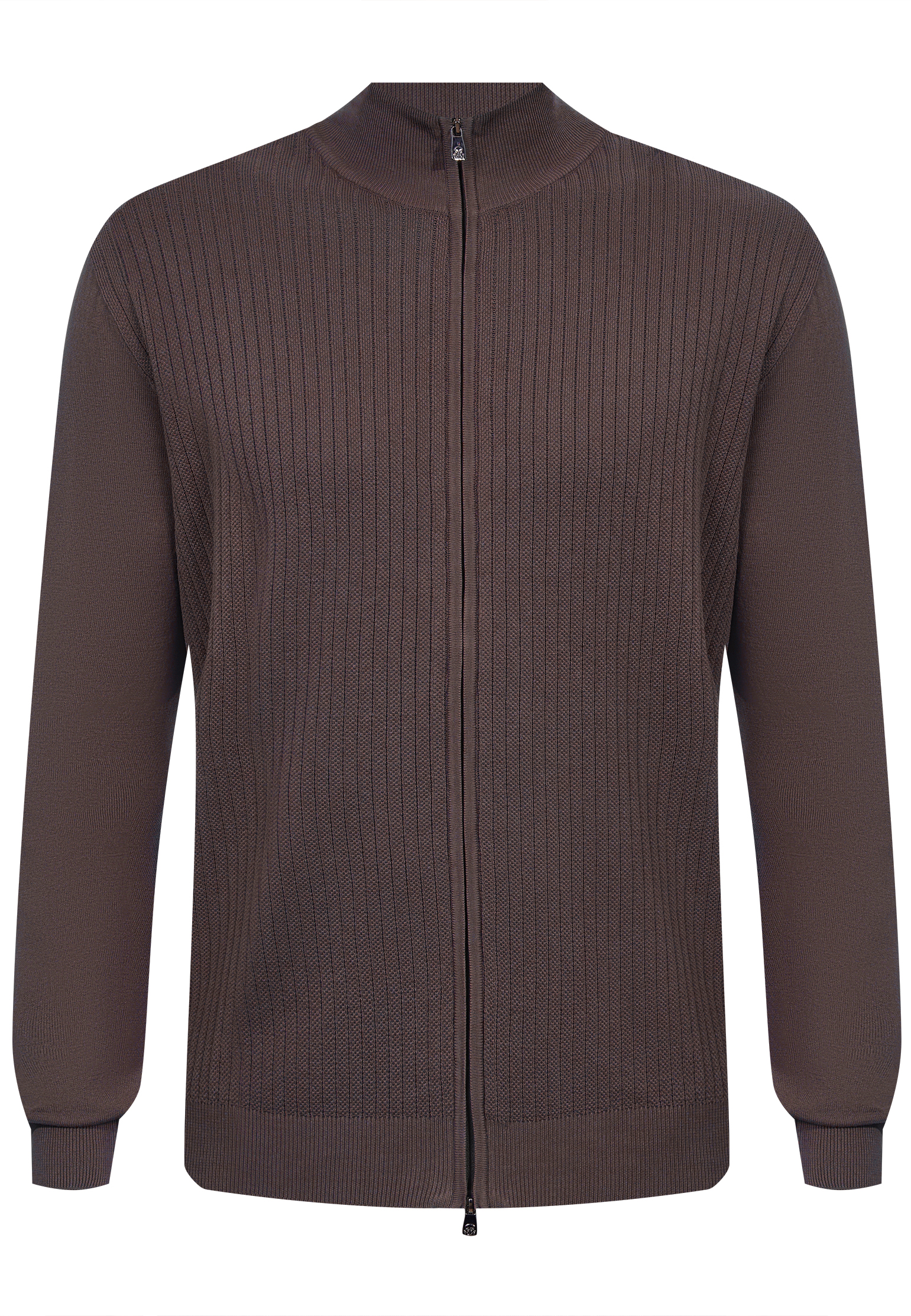 Кардиган Corneliani в серо-зеленого цвете с холодным подтоном демонстрирует сдержанную элегантность. Модель выполнена в комбинированной вязке, где фактурная рельефная поверхность передней части создает глубину и визуальный ритм, а более гладкие рукава и спинка уравновешивают силуэт, сохраняя чистоту линий. Высокая стойка и аккуратная молния добавляют изделию современную функциональность, при этом манжеты и нижний край с эластичной резинкой формируют четкую посадку; мягкая, пластичная пряжа обеспечивает комфорт и сохраняет форму, подчеркивая качество исполнения.