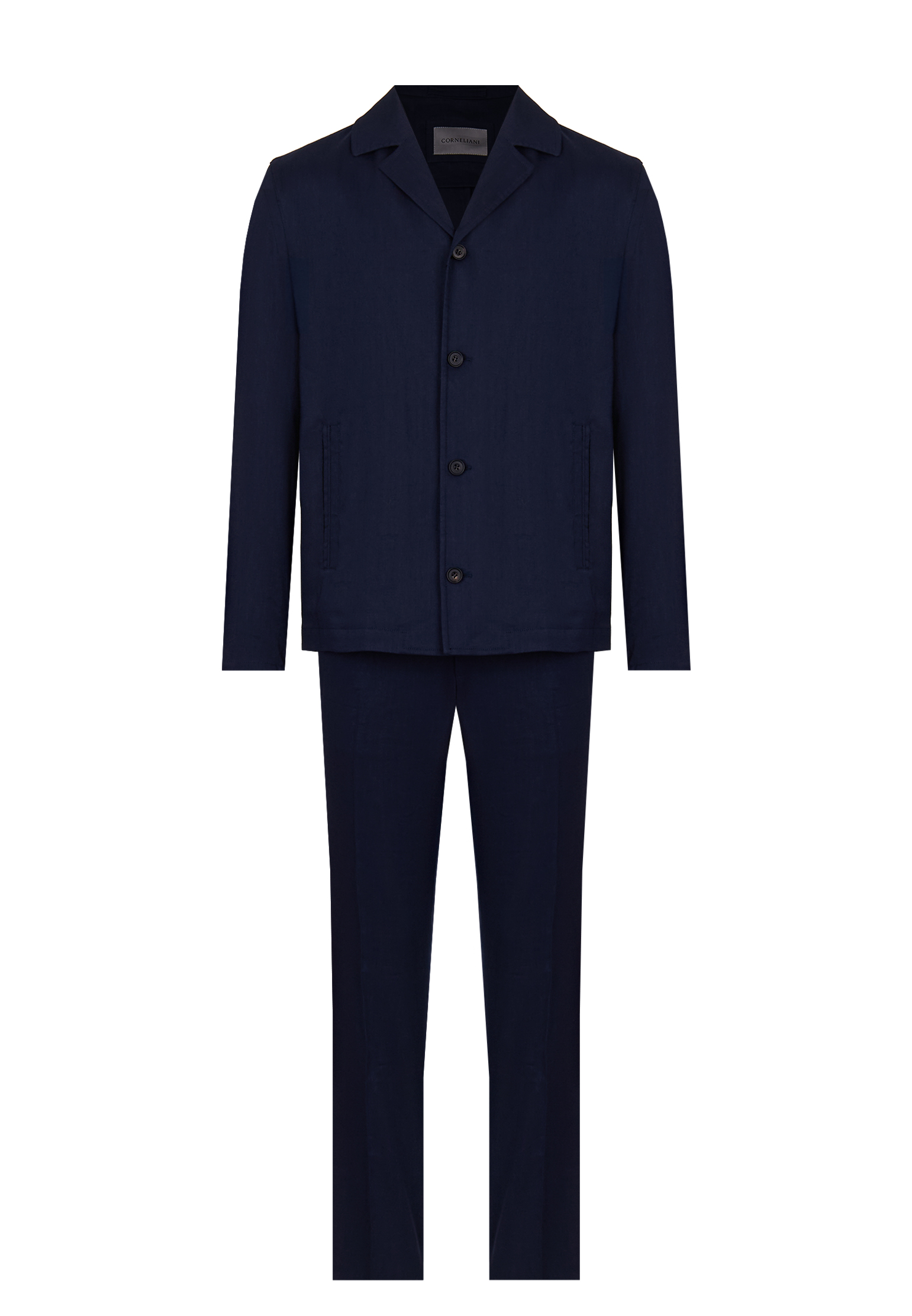 Костюм Corneliani выполнен в тёплом коричневом оттенке, который придаёт образу глубину и выразительность. Комплект состоит из лёгкого пиджака с мягкими лацканами и аккуратной застёжкой на пуговицы, формирующего расслабленный силуэт. Лаконичные боковые карманы подчёркивают чистоту линий и минималистичную архитектуру кроя, а брюки прямого силуэта обеспечивают комфортную посадку. Ткань из льна, шерсти и мохера сочетает природную лёгкость, благородную фактуру и деликатный матовый блеск, благодаря чему изделие выглядит утончённо и сохраняет форму.