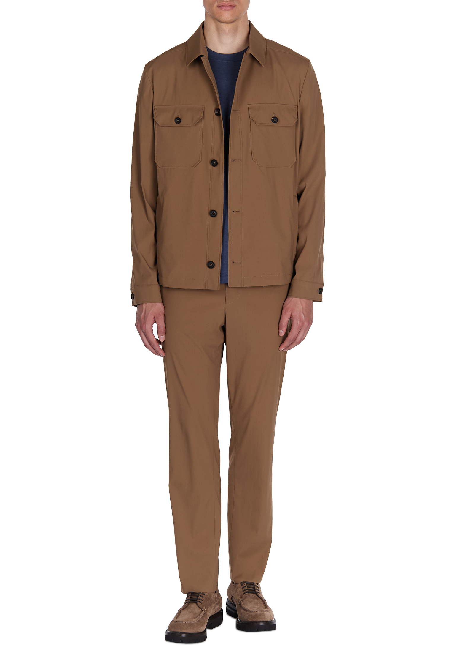 Костюм Corneliani выполнен в глубоком тёмно-синем оттенке, который подчёркивает элегантность и универсальность модели. Комплект состоит из куртки-рубашки с мягким воротником, застёжкой на пуговицы и двумя аккуратными нагрудными карманами с клапанами, создающими лаконичный силуэт. Брюки прямого кроя с чистой линией посадки гармонично продолжают композицию образа и обеспечивают комфортную свободу движения. Ткань на основе шерсти с добавлением полиамида и эластана сочетает благородную фактуру, прочность и лёгкую эластичность, благодаря чему изделие сохраняет форму и комфорт.