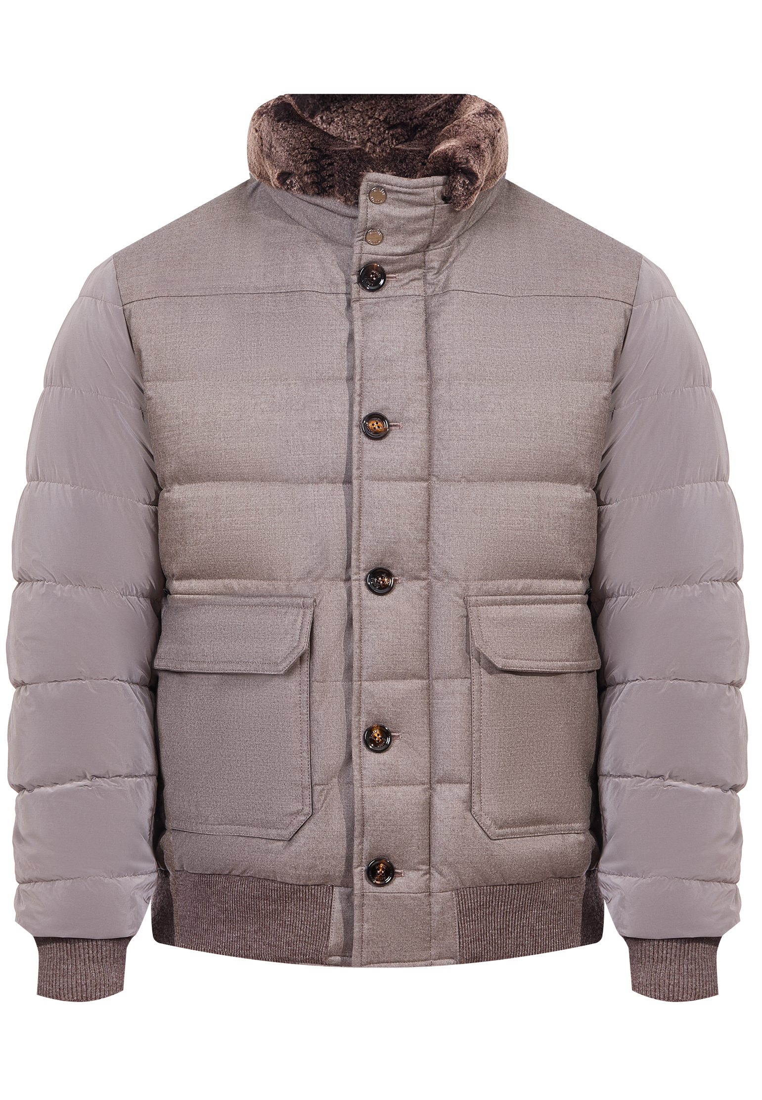 Утепленная куртка-бомбер изготовлена из смеси материалов: техническая ткань с водоотталкивающим смоляным покрытием в сочетании с деталями из фланели из шерсти с кашемиром с дышащей и водонепроницаемой мембраной. Утеплена гусиным пухом и простегана буденом. Съемный воротник из мериносовой овчины. Передняя часть и воротник выполнены из смеси натуральной шерсти с кашемировой фланелью. Двойная застежка спереди на двухзамковую молнию из матового металла и застежка на роговые кнопки. Воротник застегивается на кнопки. Манжеты и подол из мягкого эластичного шерстяного трикотажа. Накладные карманы с клапанами и двухсторонним входом на бедрах. Подкладка и стеганая внутренняя часть сзади с удобными карманами для ценных вещей.