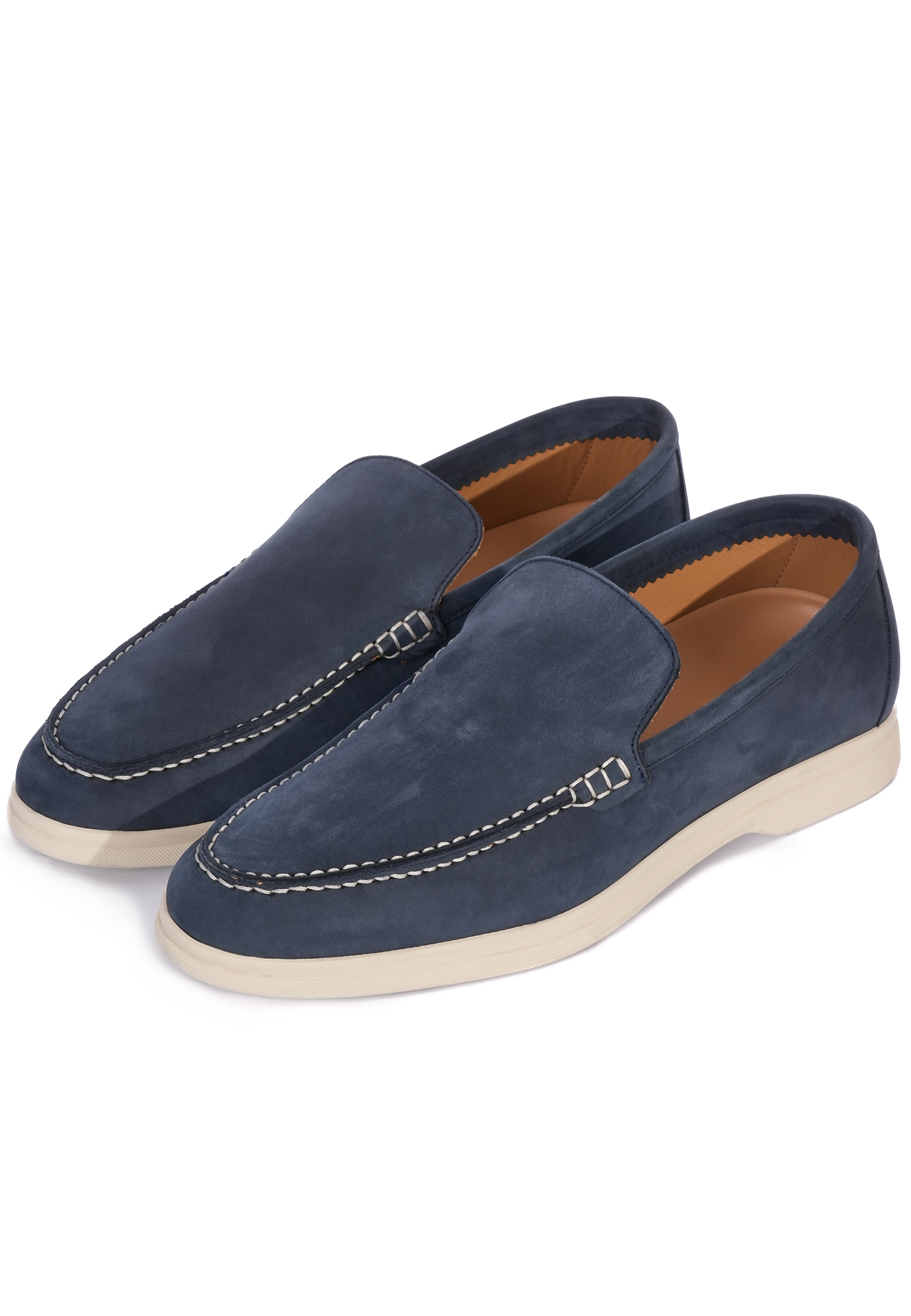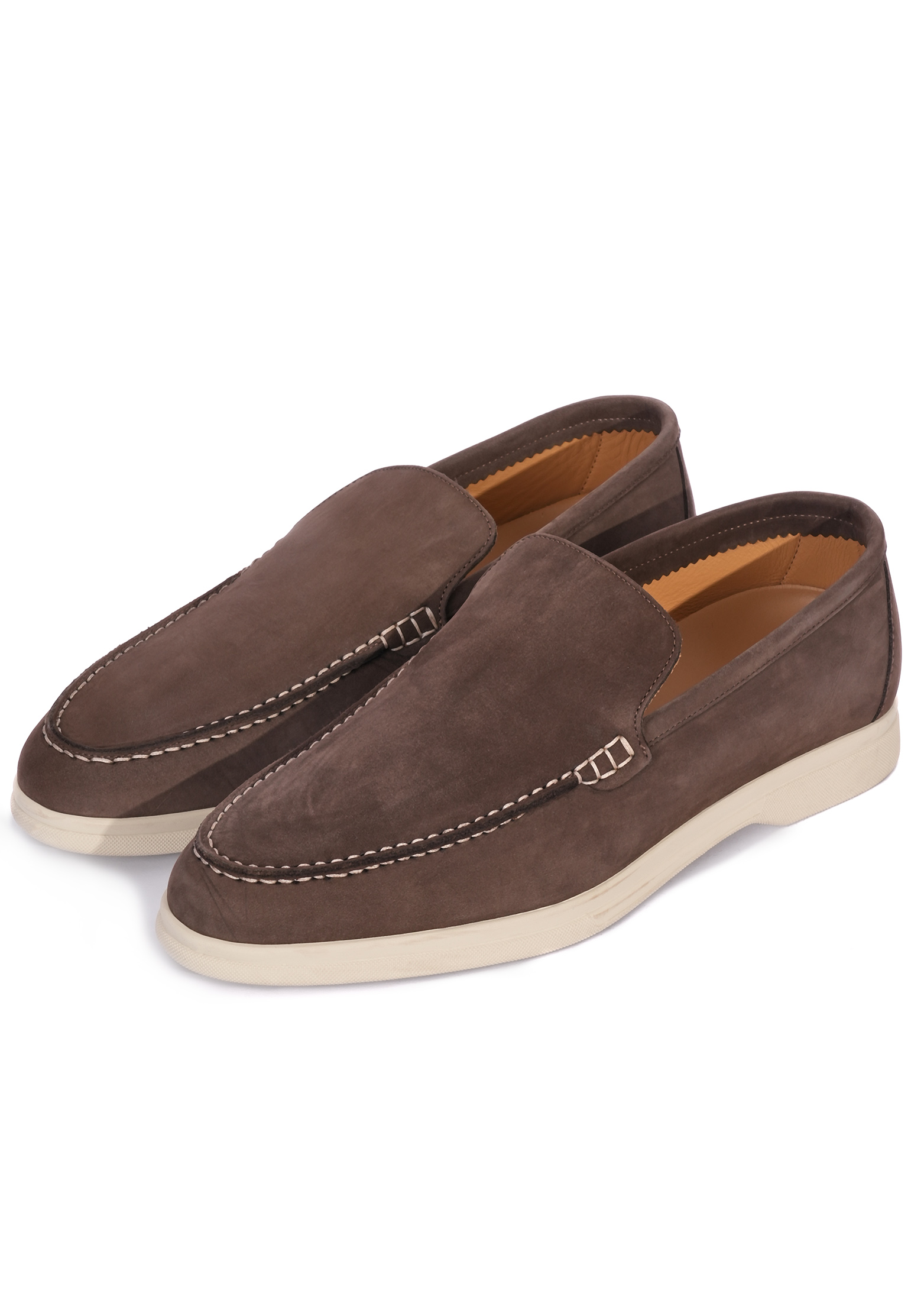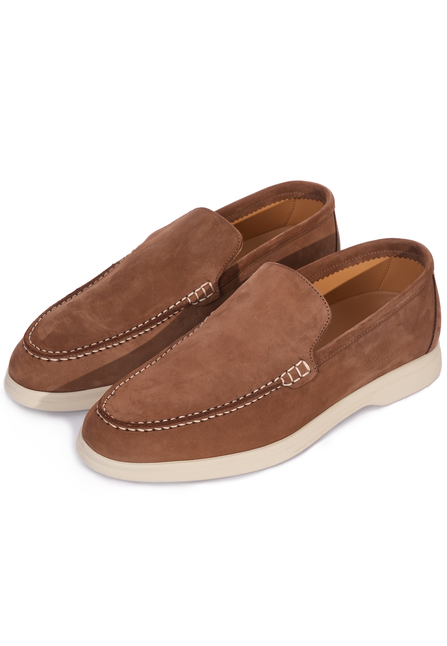 Лоферы Mandelli выполнены из натуральной замши премиального качества, отличающейся мягкостью и бархатистой текстурой. Верх изделия представлен цельнокроеной замшевой деталью, соединенной с передней частью декоративной ручной строчкой, что придает модели изысканность. Задняя часть, формирующая пятку, тщательно укреплена для сохранения формы и комфорта при носке. Подкладка выполнена из гладкой натуральной кожи, которая обеспечивает комфортное прилегание и вентиляцию. Подошва изготовлена из легкого и устойчивого каучука светлого оттенка, который создает стильный контраст с основным бежевым цветом изделия. Эти лоферы идеально подойдут для повседневного и делового гардероба благодаря их универсальности и лаконичному дизайну. Носите их с чиносами или льняными брюками для расслабленного летнего образа, либо дополняйте классическим костюмом в теплых тонах для создания стильного повседневного образа.