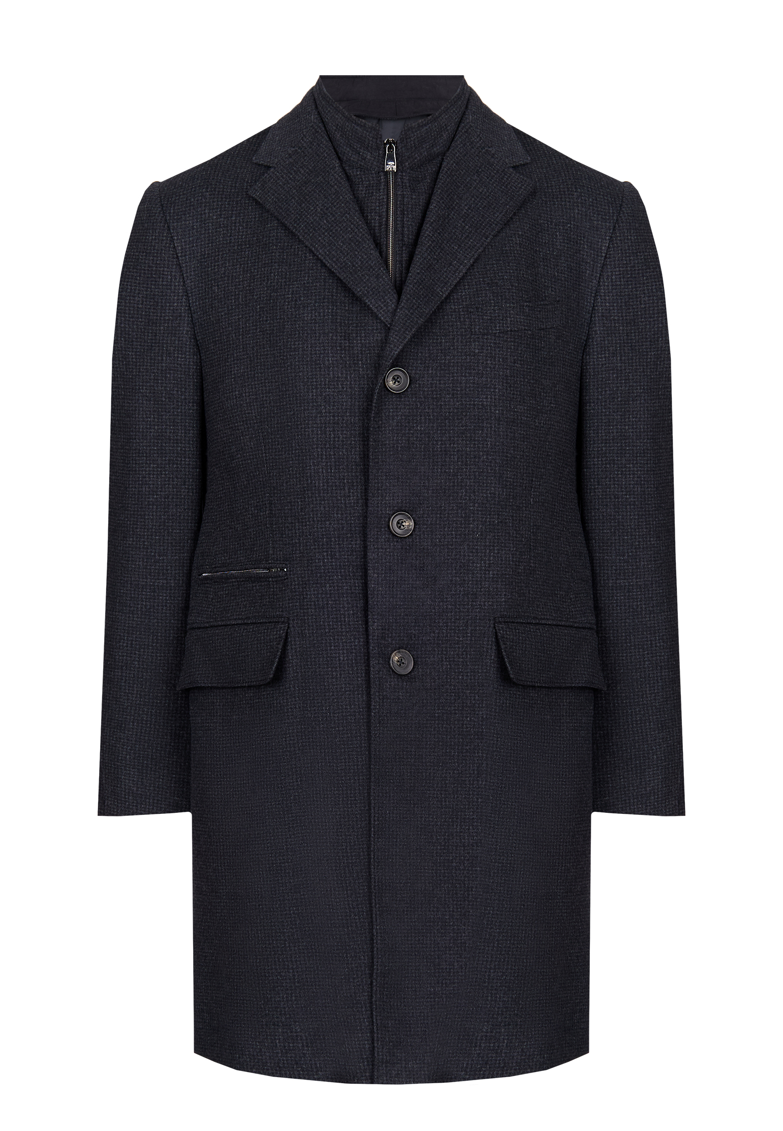 Пальто Corneliani выполнено из премиальной шерсти с добавлением кашемира, что придаёт ткани роскошь и мягкость. Глубокий тёмно-синий цвет пальто подчёркивает его утончённый стиль. Традиционный однобортный фасон с тремя пуговицами и широкими лацканами создает строгий и одновременно элегантный силуэт. Съёмный внутренний жилет с застёжкой на молнии выполнен в тон пальто. Это решение добавляет функциональности, позволяя адаптировать изделие к различным погодным условиям. На манжетах расположены декоративные пуговицы, подчеркивающие внимание к деталям. Купить его можно с удобной доставкой по всей России.