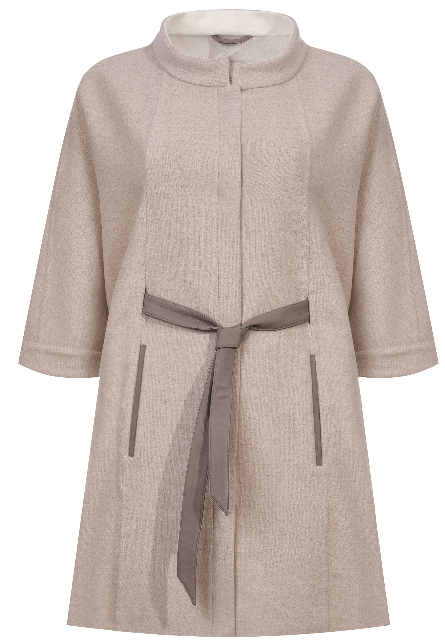 Пальто Mandelli белого цвета мастера бренда сшили из тонкой премиальной шерсти в сочетании с нежным кашемиром, который получили, вычесывая почти невесомый подшерсток монгольских коз редкой породы. Пальто с воротником-стойком и широкими рукавами декорировали кожаным поясом, подчеркивающим узкую талию. Модель свободного кроя с врезными карманами не ограничивает движения благодаря боковым разрезам.