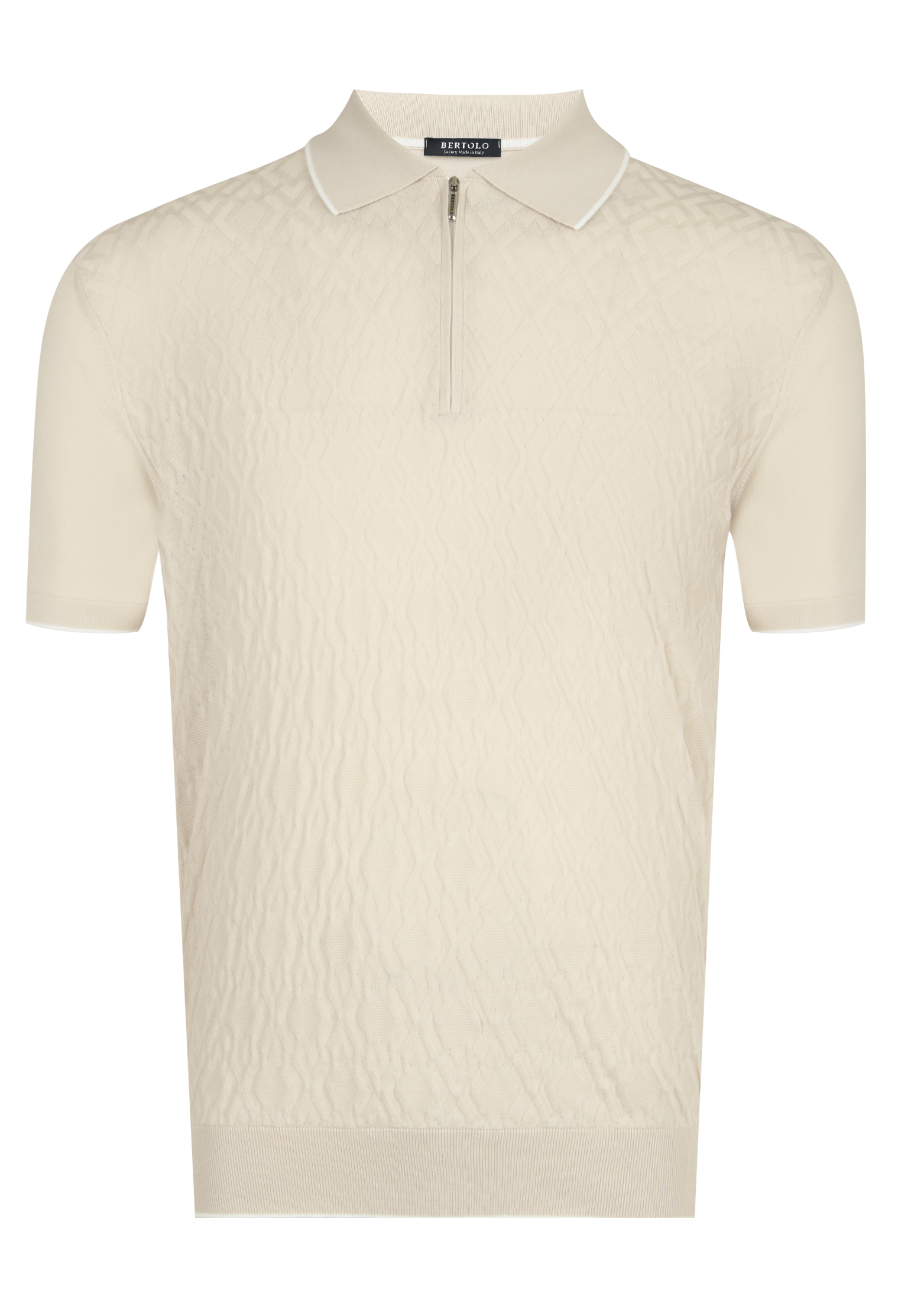 Темно-синее поло Bertolo из 100% хлопка воплощает элегантную сдержанность и практичность. Изделие прямого кроя – универсальная модель для любого случая. Воротник с молнией и аккуратная контрастная окантовка подчёркивают лаконичный стиль, который легко комбинируется с другими элементами гардероба.  Декоративное плетение на ткани создаёт текстурный узор, добавляющий поло изысканности. Модель идеально подходит для тех, кто ценит классический стиль с современными акцентами.