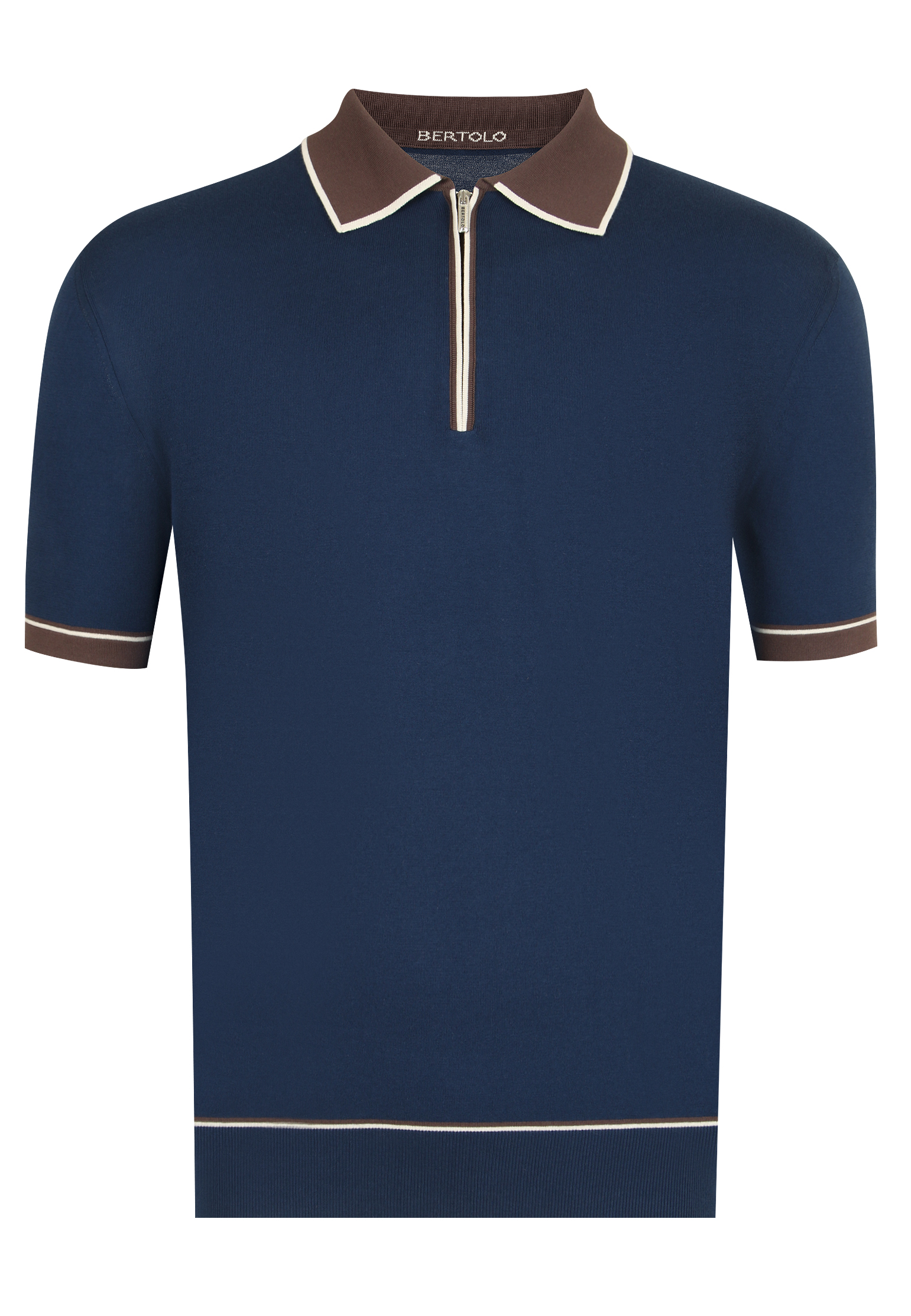 Голубая поло Bertolo с тёмно-синими контрастными акцентами на воротнике, манжетах и нижнем крае — воплощение легкости и сдержанной элегантности с современным акцентом. Изделие выполнено из 100% хлопка, что обеспечивает мягкость и приятную текстуру. Прямой крой и застежка на молнии. Контрастные синие полосы на воротнике и манжетах создают ощущение классического стиля с оттенком ретро-шика, позволяя сочетать эту модель как с повседневными брюками, так и с более формальными комплектами.