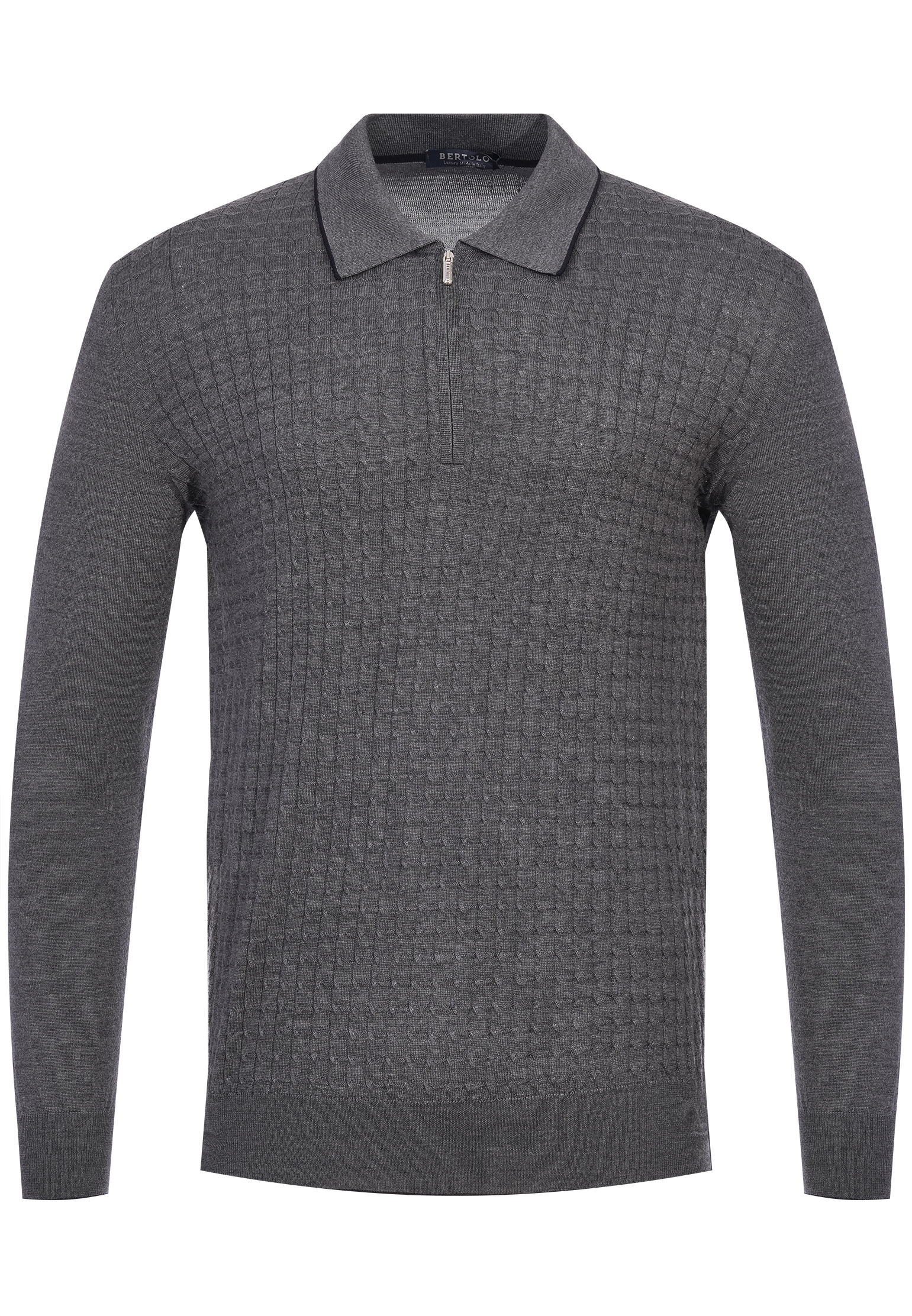 Поло Bertolo выполнено в изысканном синем оттенке, который придает ему элегантность и свежесть. Ткань имеет тонкую фактуру с геометрическим плетением, что добавляет визуальной сложности и утонченности. Воротник выполнен в традиционном стиле с аккуратной отделкой контрастной светлой линией, которая подчеркивает его изящество. Застежка-молния в верхней части изделия является функциональной и одновременно декоративной деталью, привлекающей внимание. Манжеты и нижняя кромка снабжены эластичной вязкой, что обеспечивает удобную посадку и завершенность образа. Это поло идеально подходит для создания повседневного гардероба с акцентом на изысканность. Носите его с нейтральными брюками или светлыми джинсами для стильного, но ненавязчивого образа, либо комбинируйте с контрастными оттенками, чтобы подчеркнуть насыщенность синего.