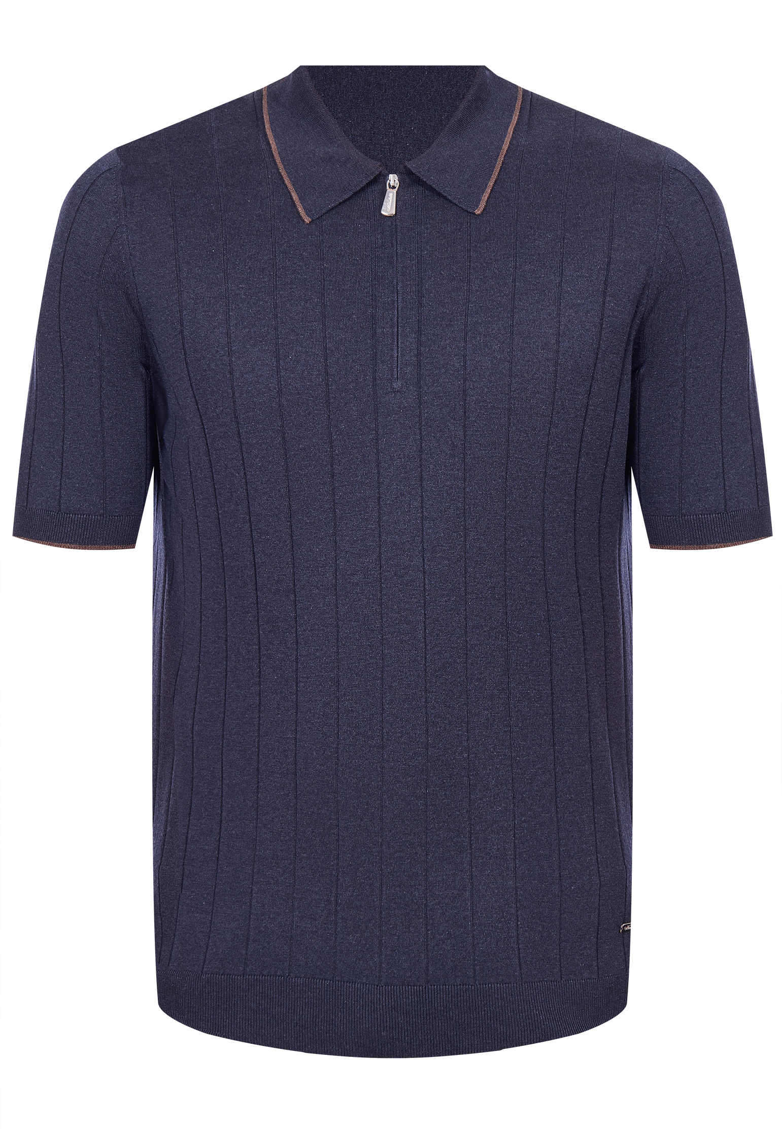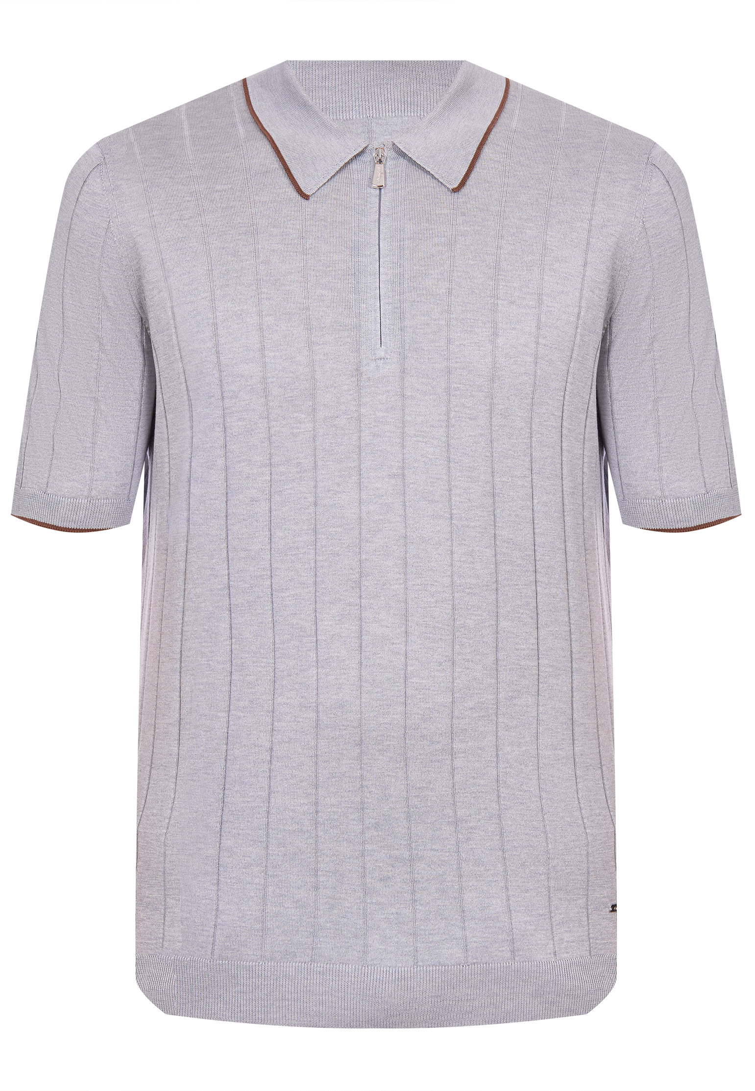 Поло Mandelli выполнено из тонкого трикотажа в шоколадном оттенке, который придает модели сдержанную элегантность. Вертикальная фактурная вязка формирует аккуратный рельеф и визуально вытягивает силуэт. Классический воротник дополнен короткой молнией с металлической фурнитурой, добавляющей современный акцент, как и контрастная тонкая окантовка по краю воротника. Манжеты рукавов и нижняя планка выполнены эластичной вязкой, обеспечивая аккуратную посадку и комфорт.