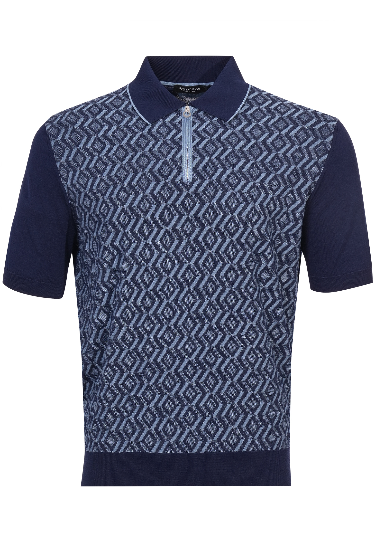 Поло Stefano Ricci выполнено в базовом бежевом оттенке с выразительным геометрическим узором на передней части. Трикотажная фактура ткани придает изделию мягкость и позволяет сохранять форму после продолжительной носки. Спинка и рукава остаются однотонными, что подчеркивает контраст и делает рисунок на передней панели более заметным. Отложной воротник с короткой молнией и декоративной кантовкой добавляет изделию аккуратности и завершенности, а фирменный металлический бегунок с логотипом бренда подчеркивает внимание к деталям. Эластичные манжеты и нижний край обеспечивают комфортное прилегание к телу без ограничения движений. Поло гармонично сочетается с классическими брюками или джинсами, создавая сбалансированный образ для повседневного и элегантного стиля.