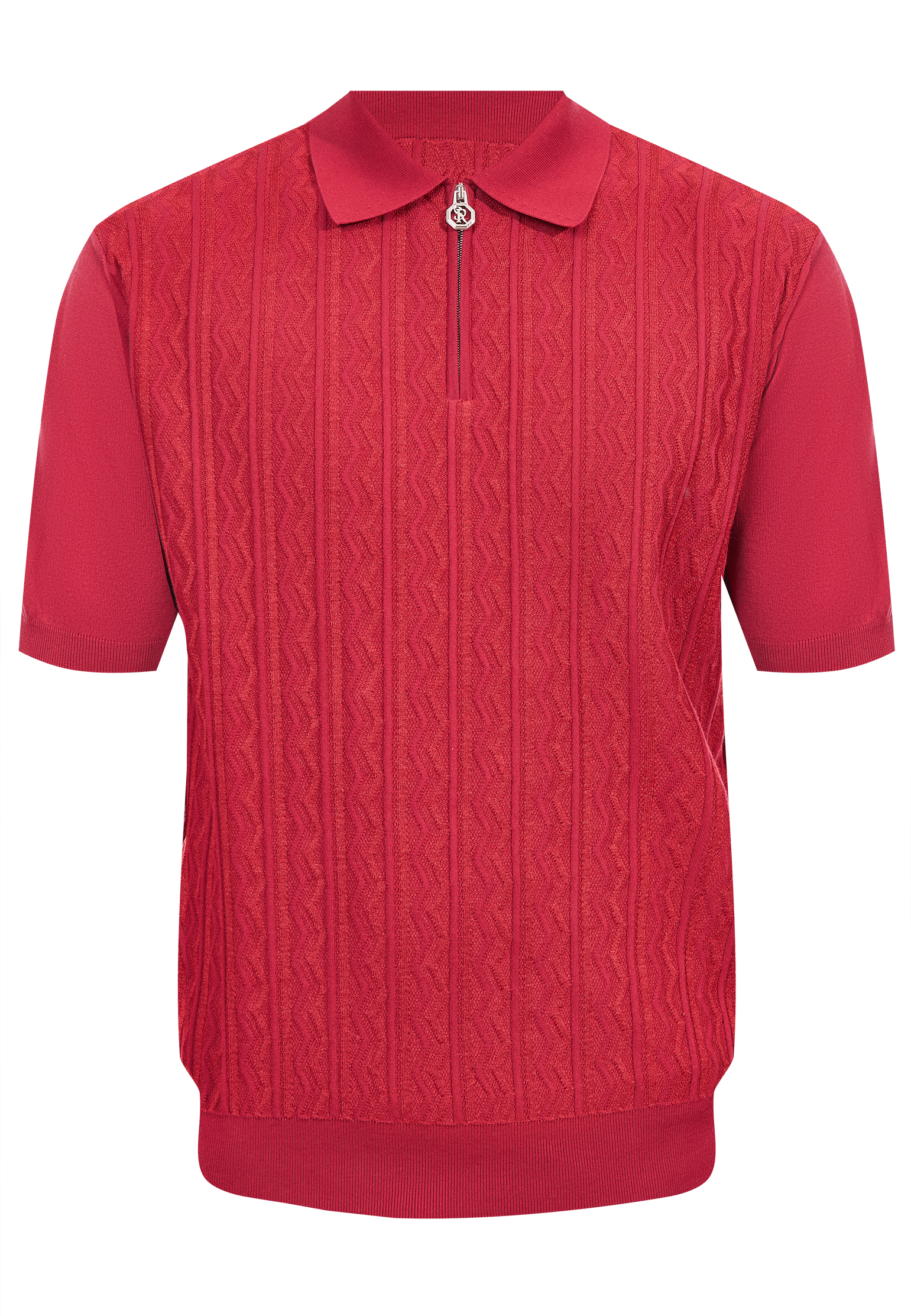 Синее поло Stefano Ricci выполнено в сложной фактурной вязке с рельефным рисунком. Передняя часть украшена зигзагообразным мотивом, что подчеркивает мастерство исполнения,а рукава и спинка выполнены в более гладкой вязке, создавая элегантный контраст фактур. Аккуратный воротник и короткая молния с фирменной фурнитурой с символикой бренда добавляют образу статусный акцент. Плотные эластичные манжеты и нижняя кромка обеспечивают идеальную посадку и чистоту силуэта.