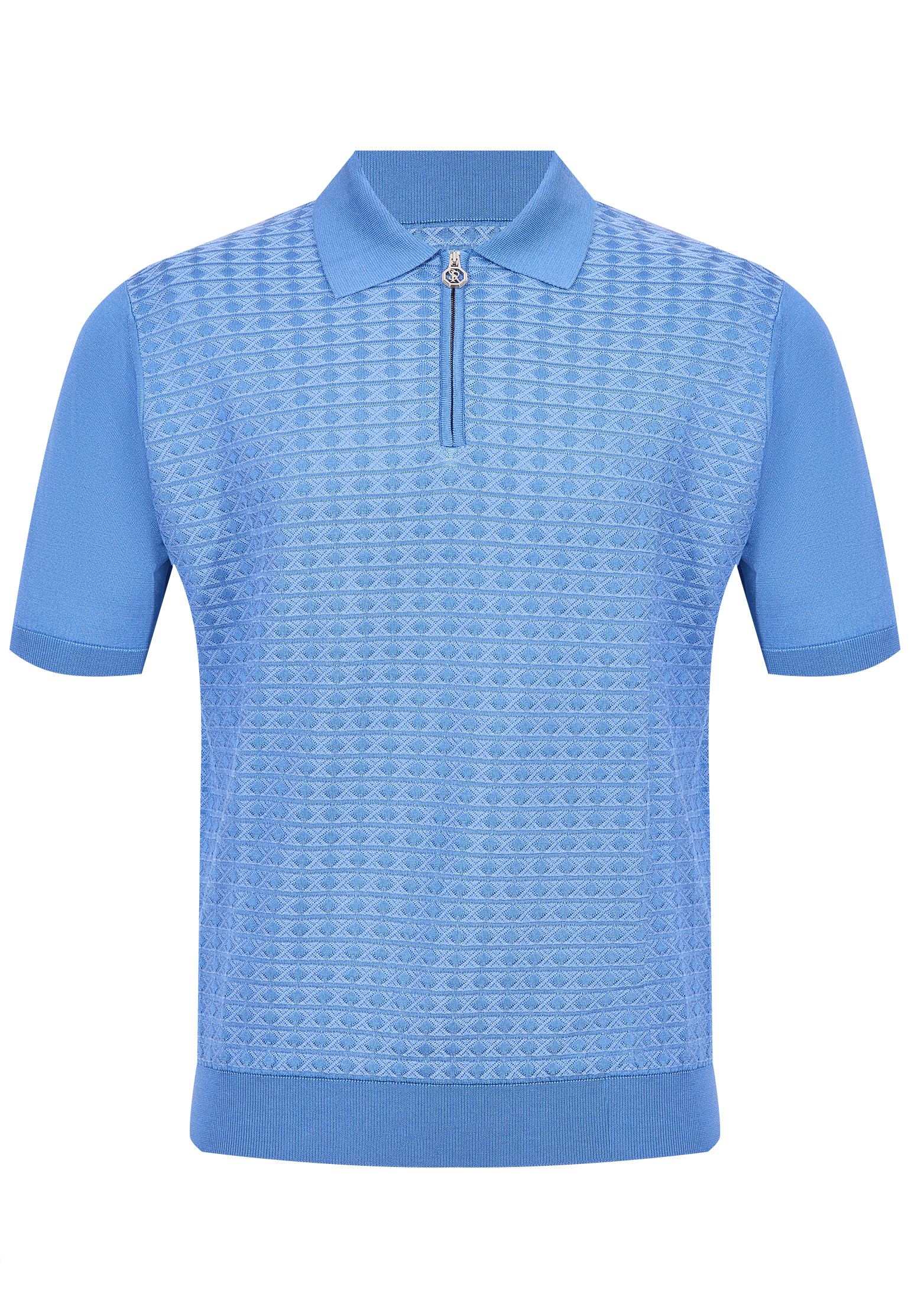 Поло Stefano Ricci выполнено в глубоком темно-синем оттенке, который придаёт образу сдержанную роскошь и универсальность. Модель отличается сложной фактурной вязкой с изысканным геометрическим узором, создающим эффект объёма. Лаконичный отложной воротник и аккуратная молния с фирменной фурнитурой подчеркивают современную элегантность, а эластичные манжеты и нижняя планка формируют безупречный силуэт, отражая ДНК бренда.