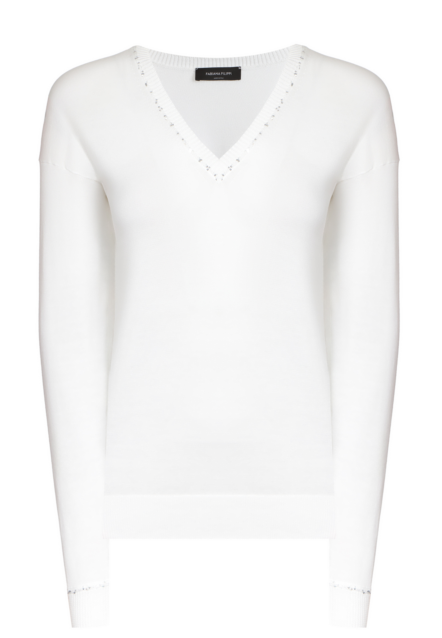 Пуловер Fabiana Filippi — воплощение изысканной лаконичности и утончённого итальянского стиля, неотъемлемая часть ДНК бренда, который ставит во главу угла качество, комфорт и элегантность. Выполнен из высококачественного хлопка с тонкой, равномерной вязкой, обеспечивающей превосходную воздухопроницаемость и мягкость, что гарантирует комфортное и приятное ощущение на коже. Нежный бежевый оттенок, близкий к нюдовым тонам, подчёркивает естественную гармонию и универсальность изделия, делая его идеальной базой для создания как повседневных, так и более утончённых образов. Классический V-образный вырез аккуратно обрамлён тонкой отделкой из миниатюрных пайеток, которые придают пуловеру легкое мерцание, добавляя изящества и деликатного блеска, сохраняя при этом сдержанную элегантность. Ребристая вязка манжет и нижнего края изделия обеспечивает идеальную посадку и долговечность формы, подчёркивая мастерство исполнения и внимание к деталям. Купить его можно с удобной доставкой по всей России.