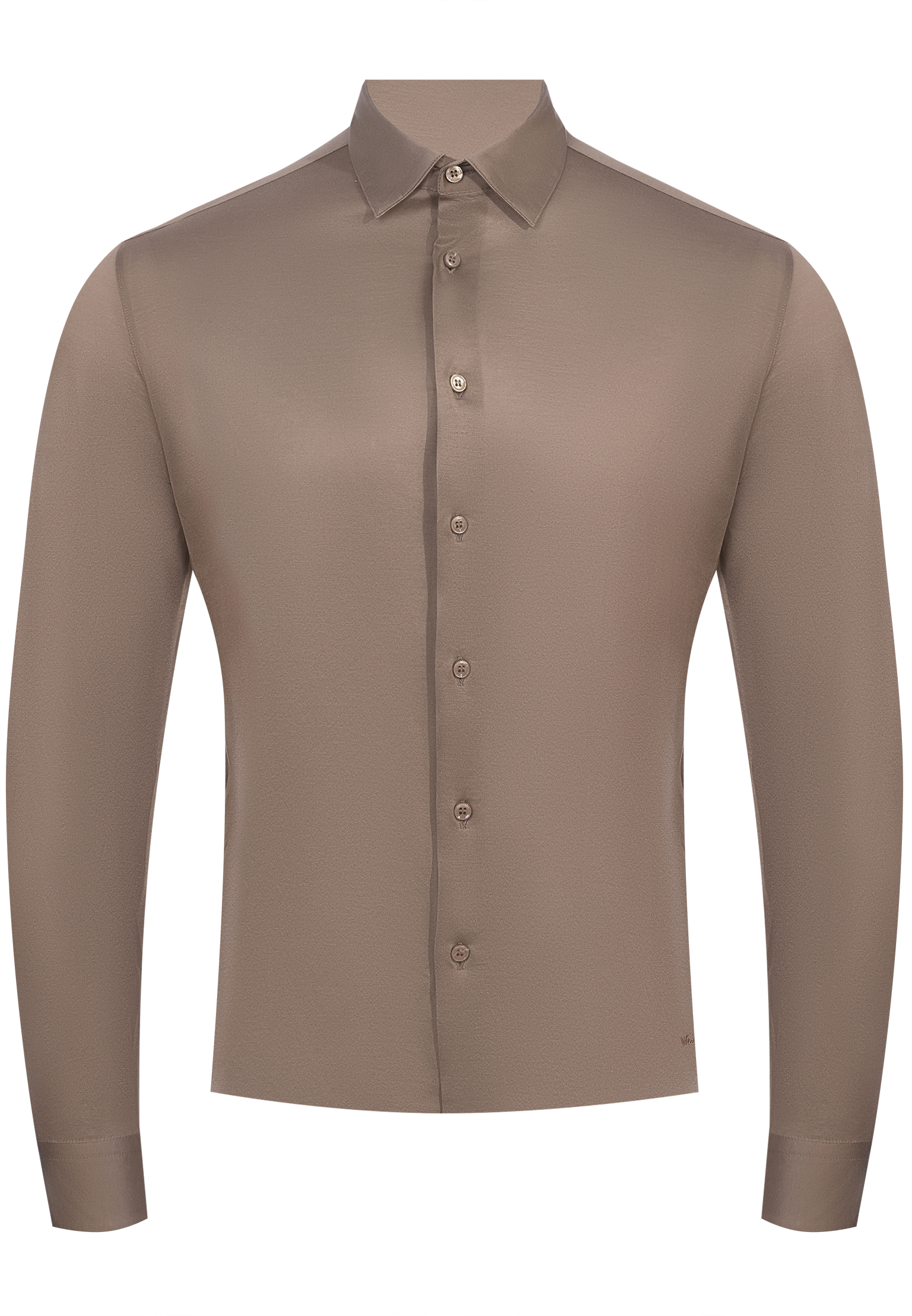 Рубашка Mandelli выполнена из нежного шелковистого материала, который отличается легкостью и благородным блеском. Основное полотно изделия аккуратно обработано французским швом, что подчеркивает его премиальное качество. Воротник "Kent" с четкими линиями и идеально отрегулированной высотой добавляет изделию элегантности. Планка застежки выполнена в виде скрытой шлифованной петли и украшена пуговицами из натурального перламутра, которые закреплены при помощи прочной нити в тон ткани. Манжеты имеют утонченный прямоугольный крой с одним перламутровым пуговичным креплением. Линия плеча усилена двойной строчкой, что гарантирует долговечность и сохранение формы. Нижний край рубашки закруглен, с декоративным кантом, позволяющим удобно заправлять изделие в брюки или носить навыпуск. На нижней части изделия, возле бокового шва, размещена вышивка с логотипом бренда, выполненная в тон ткани, что добавляет утонченности и завершенности. Цвет рубашки прекрасно подходит для летних образов, поэтому её можно носить с легкими светлыми брюками и мокасинами, создавая утонченный стиль smart casual.