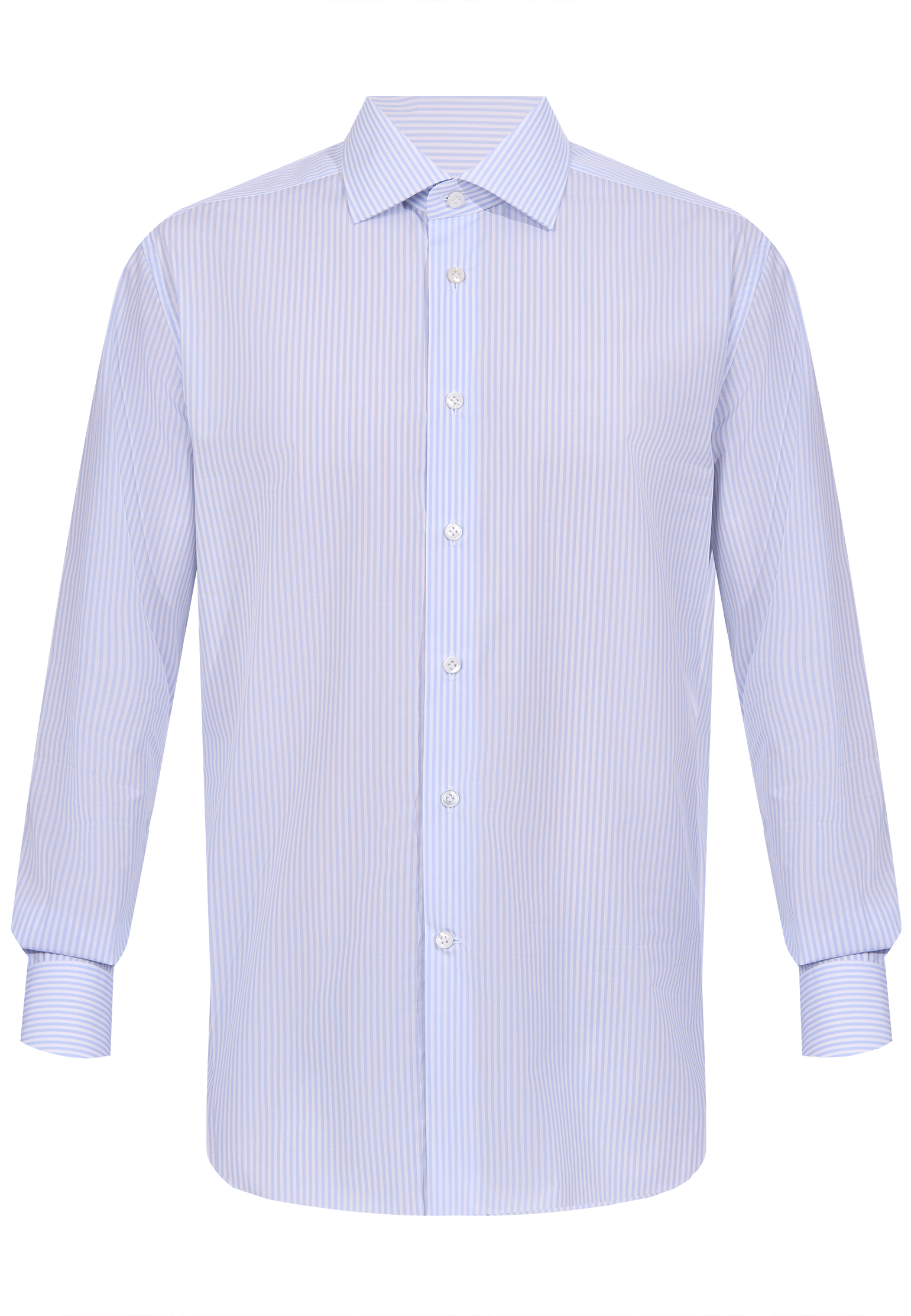 Рубашка Corneliani выполнена из тонкого гладкого хлопка с выразительным вертикальным рисунком в насыщенную синюю полоску на белом фоне, который визуально вытягивает силуэт и придает модели элегантность. Классический воротник строгой формы аккуратно подчеркивает линию шеи и гармонично сочетается с чистой планкой на светлых перламутровых пуговицах. Манжеты и плечевые линии обработаны с безупречной точностью, отражая внимание к деталям.