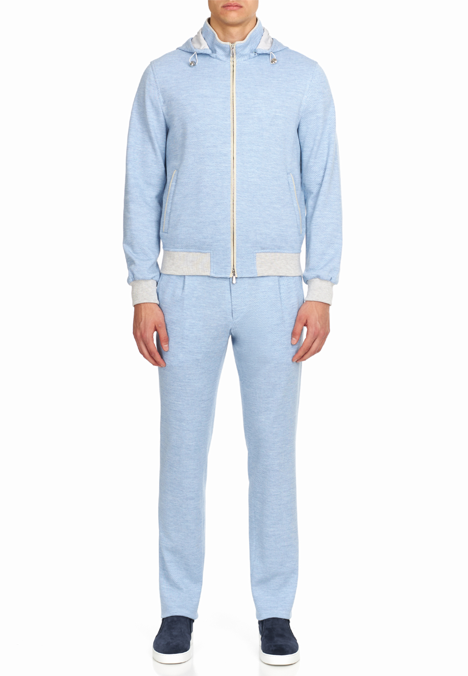 Спортивный костюм Mandelli темно-синего цвета выполнен из шерсти и хлопка, что придаёт ему мягкость и обеспечивает тепло. Капюшон с двойной подкладкой оснащен шнурком с металлическими наконечниками, который продет через люверсы с фирменной гравировкой Mandelli. Центральная молния выполнена из высококачественного нержавеющего металла, с бегунком, украшенным логотипом бренда. Контрастные эластичные манжеты на рукавах и нижнем крае толстовки добавляют выразительный акцент. Брюки оснащены мягким эластичным поясом с дополнительным шнурком. Защипы на передней части брюк добавляют элегантный объем и делают посадку более удобной. На задней стороне брюк находятся накладные карманы, которые сохраняют баланс между стилем и функциональностью. Легкая зауженность к низу подчеркивает современный силуэт. Спортивный костюм — это сочетание элегантности и комфорта, идеально подходящее для повседневного образа.
