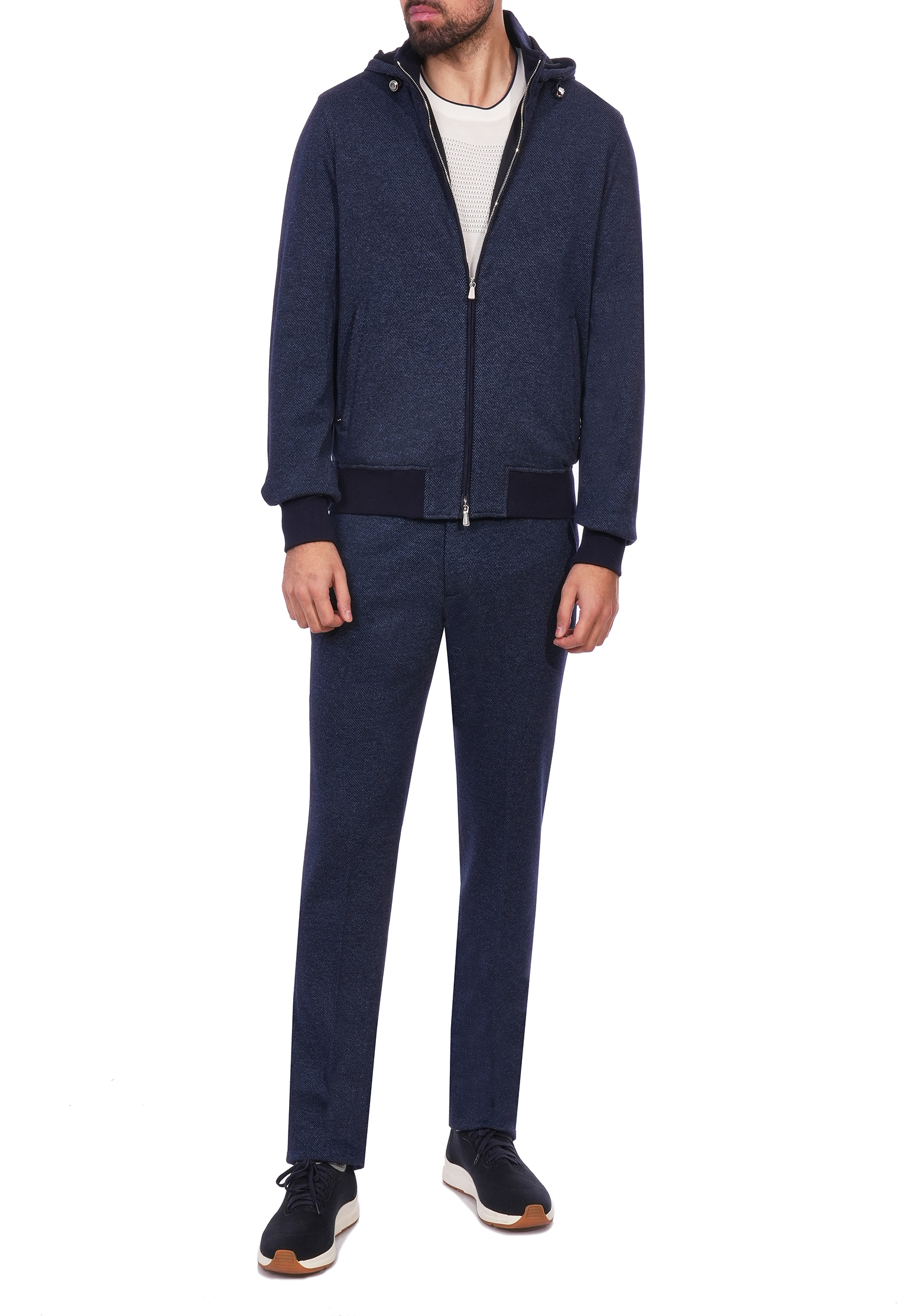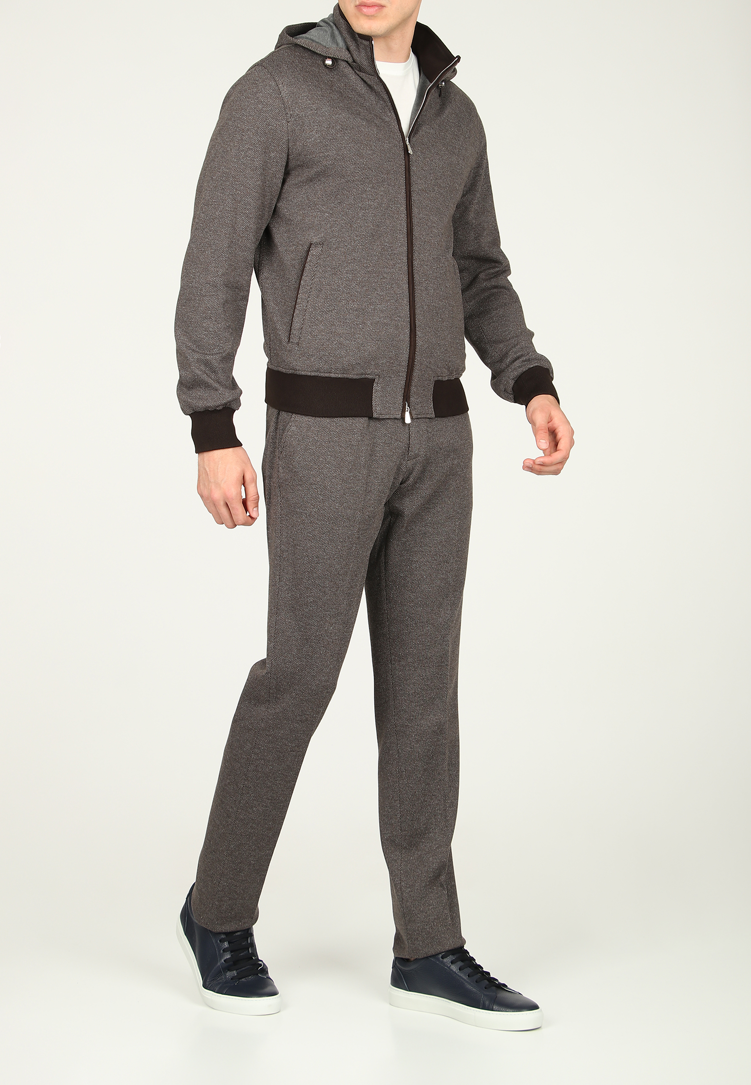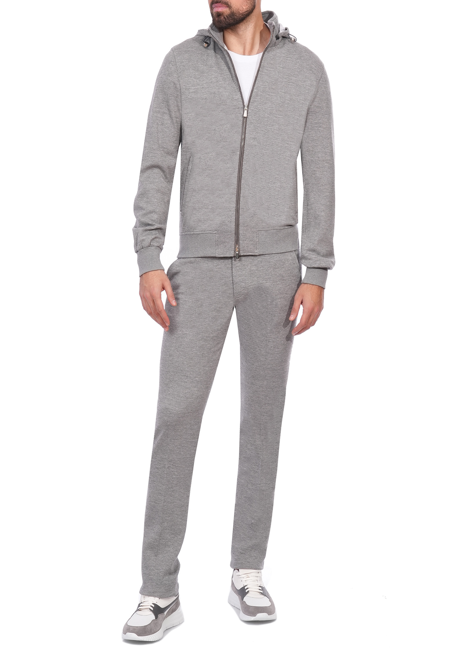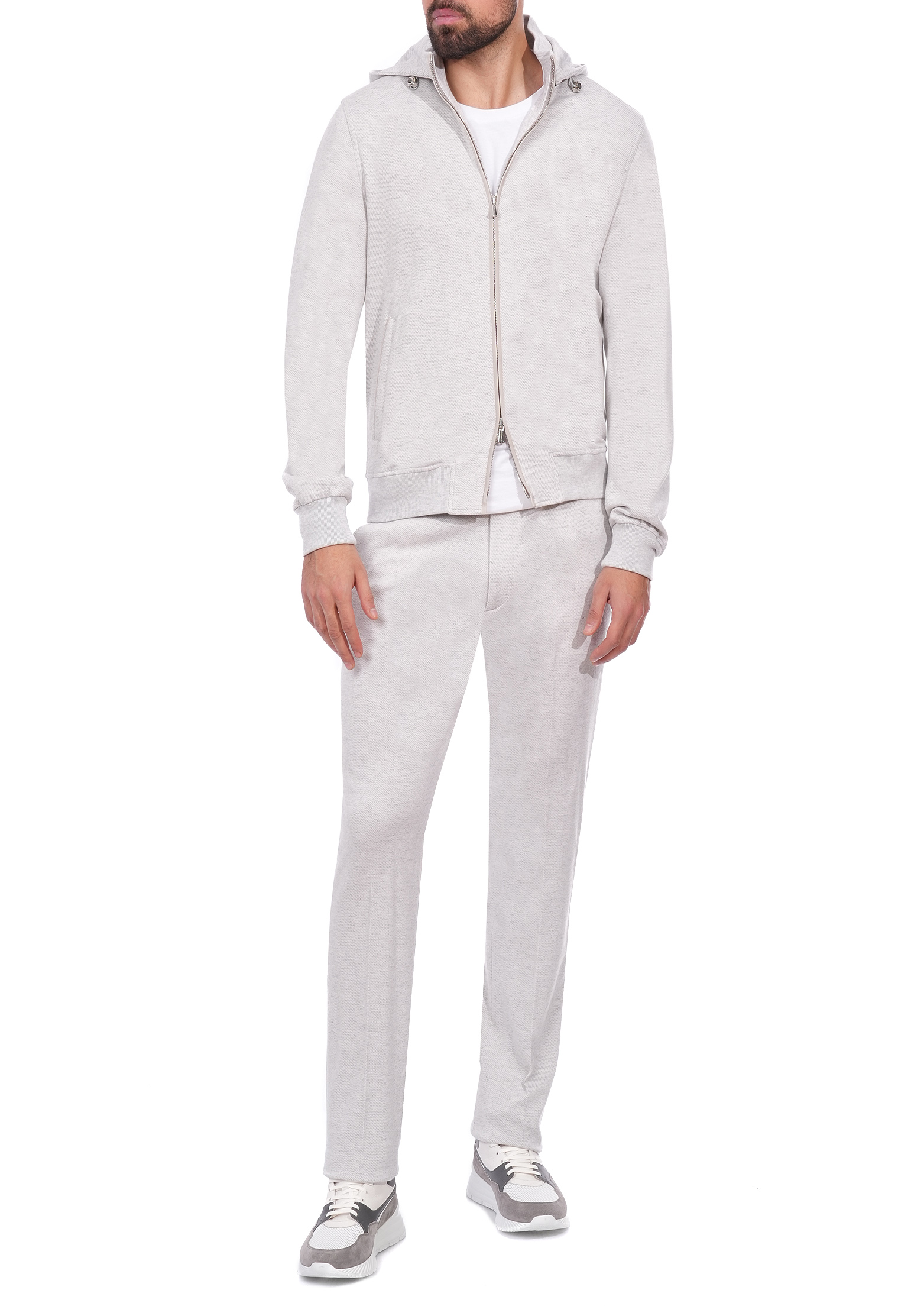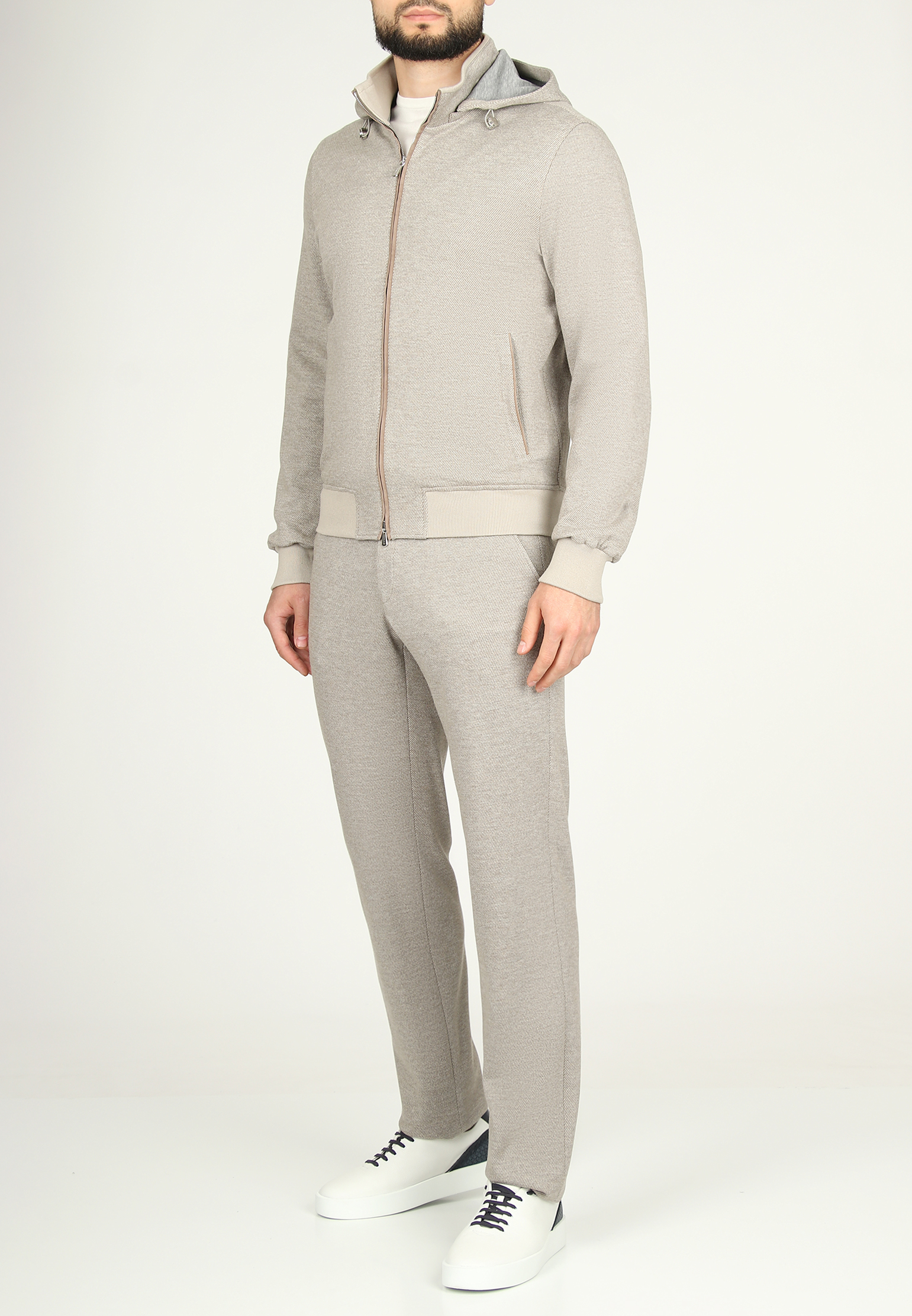Светло-бежевый костюм Mandelli из шерсти и хлопка сочетает в себе элегантность и комфорт. Верх выполнен в виде олимпийки на молнии с капюшоном, что придаёт изделию спортивный и современный вид. Благодаря мягкой подкладке и регулируемому капюшону костюм обеспечивает тепло и защиту в прохладную погоду. В передней части олимпийки расположены функциональные прорезные карманы, что делает модель практичной и удобной для повседневного использования. Рукава и низ изделия дополнены эластичными манжетами, которые обеспечивают идеальную посадку. Брюки имеют прямой крой и дополнены эластичным поясом со шнурком, что позволяет регулировать посадку на талии для максимального комфорта. Спереди расположены два боковых кармана. Ткань из шерсти и хлопка обеспечивает мягкость, долговечность и приятные тактильные ощущения, делая костюм идеальным вариантом для прогулок, путешествий и расслабленного стиля на каждый день.