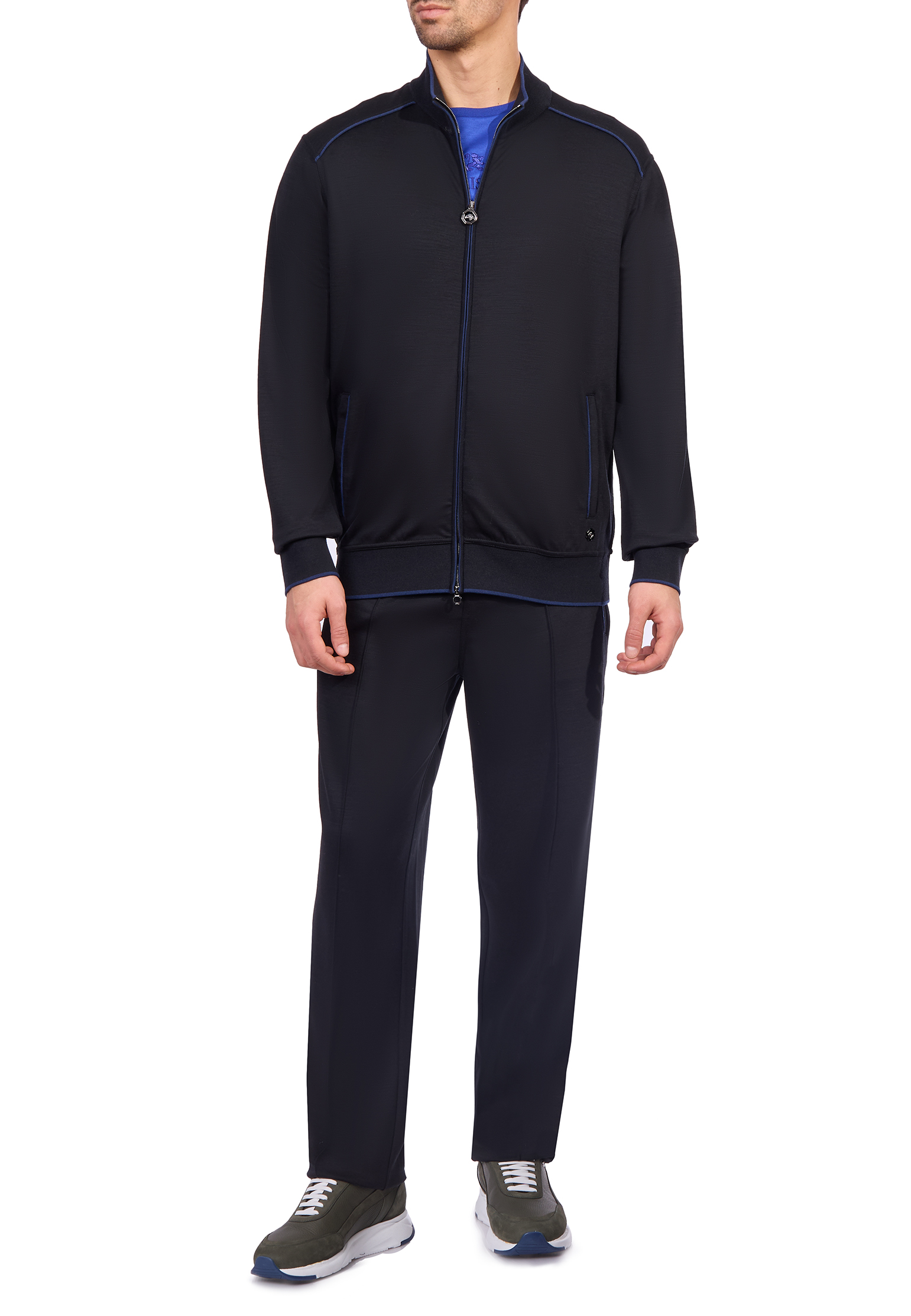 Спортивный костюм Stefano Ricci излучает роскошь и мастерство, связанные с ДНК бренда. Богатый синий цвет наполняет образ глубиной и элегантностью, создавая утонченный и современный стиль. Шерсть обеспечивает непревзойденный комфорт и изысканность. Верх костюма украшен молнией с фирменной гравировкой, придающей изделию изящный акцент, а воротник-стойка добавляет завершенность образу. Брюки с идеальной посадкой и подчеркнутыми линиями создают стройный силуэт, гармонично соединяя стиль и практичность. Изящные манжеты и аккуратные карманы отражают внимание к деталям, демонстрируя исключительное качество и изящество. Купить их можно с удобной доставкой по всей России.