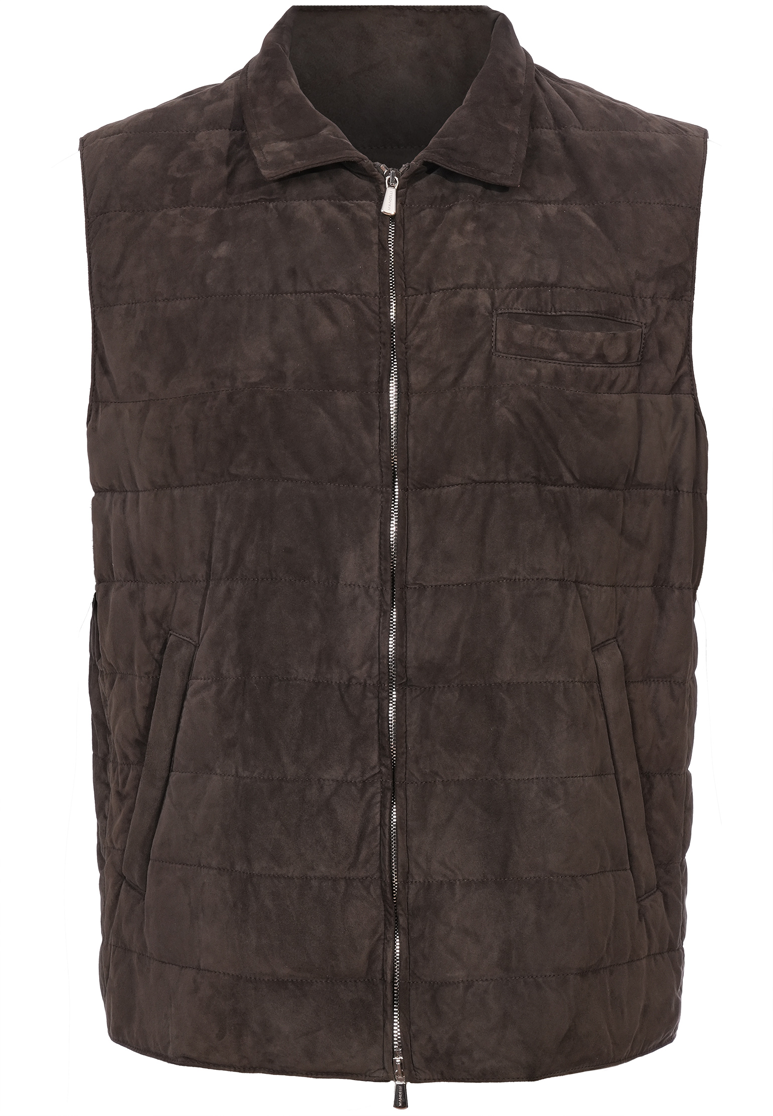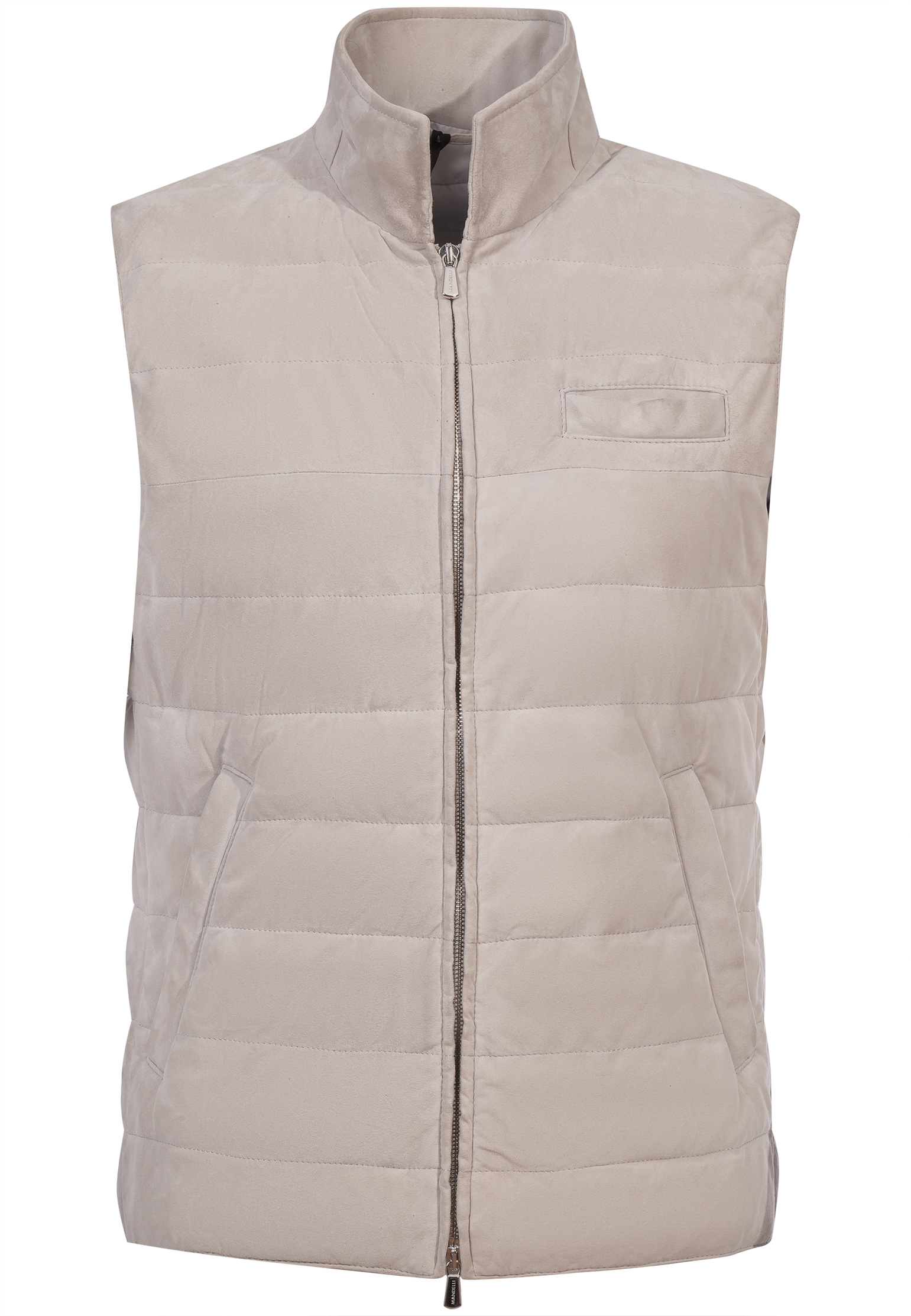 Жилет Mandelli выполнен из мягкой замши благородного голубого оттенка, что придаёт изделию утончённый и изысканный вид. Материал отличается приятной текстурой и высоким качеством, обеспечивая долговечность и комфорт. Прострочка по горизонтальным линиям добавляет изделию структурности и стильной геометрии, создавая визуальный интерес и подчеркивая точность исполнения. Высокий воротник защищает от прохладного ветра, придавая жилету функциональность и современный облик. Центральная застёжка-молния выполнена из прочного металла с двухсторонним бегунком, что позволяет регулировать посадку жилета в зависимости от ситуации. На передней части расположен аккуратный прорезной нагрудный карман, который добавляет функциональности и гармонично вписывается в общий дизайн. По бокам размещены удобные карманы, которые подчеркивают практичность и минималистичный подход к деталям. Этот жилет идеально подходит для создания многослойных образов и легко вписывается как в повседневный, так и в более изысканный стиль. В неформальном луке его можно сочетать с кашемировым свитером светло-серого или бежевого оттенка, темно-синими джинсами и кожаными кедами. Для образа в стиле smart casual жилет гармонично дополнит рубашку классического кроя, брюки чинос и лоферы. Чтобы добавить элегантности, можно надеть под жилет водолазку, дополнив образ классическими брюками и ботинками челси. Голубой оттенок жилета позволяет легко комбинировать его с различными цветами — от нейтральных тонов до насыщенных контрастов, таких как бордовый, коричневый или изумрудный. В качестве аксессуаров стоит выбирать минималистичные изделия: кожаный ремень, классические часы с кожаным ремешком или текстильный шарф в светлых тонах для прохладной погоды. Этот жилет Mandelli — это идеальное сочетание стиля, комфорта и универсальности, которое станет отличным дополнением гардероба для создания изысканных и функциональных образов.