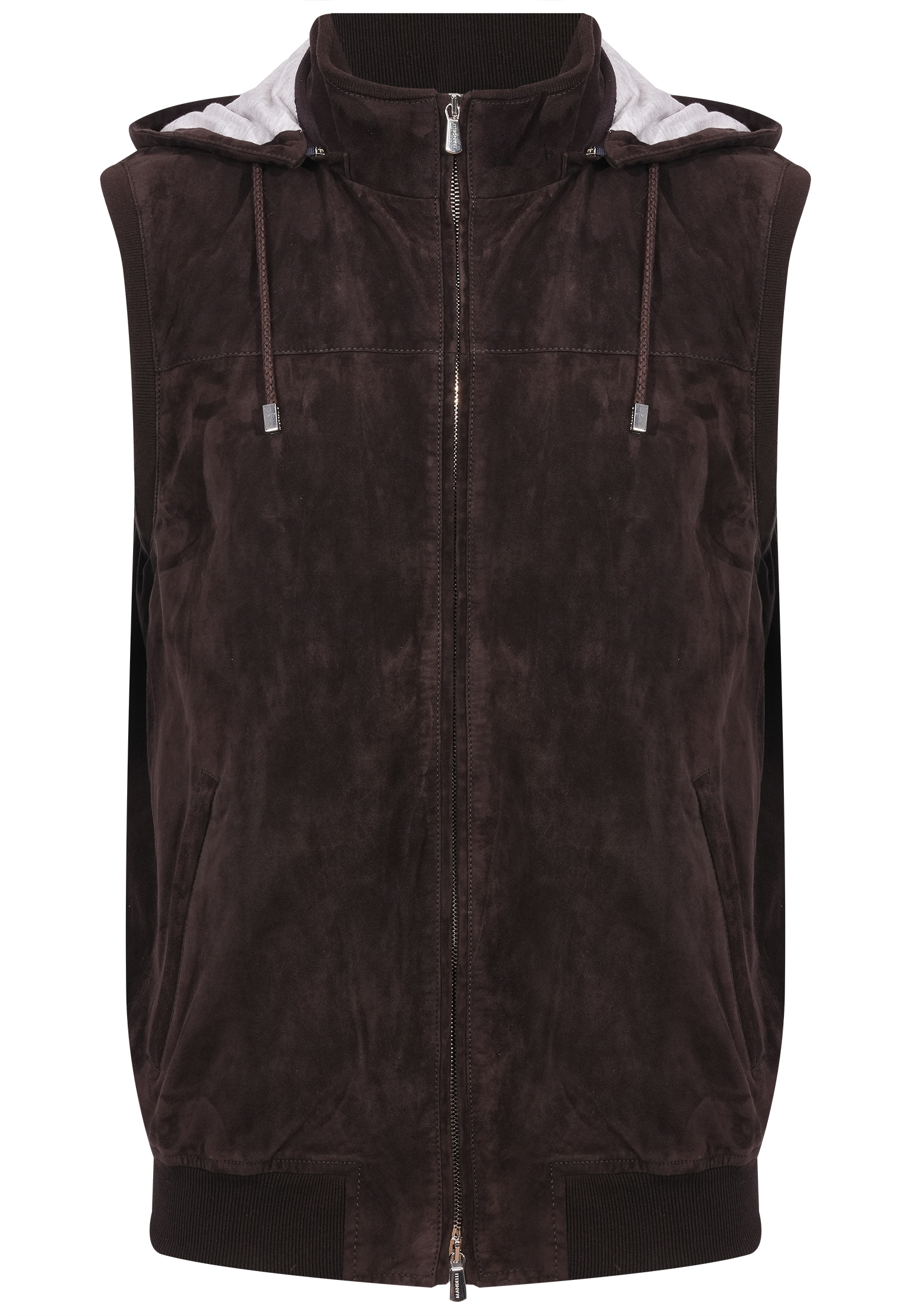 Жилет Mandelli выполнен из натуральной замши высочайшего качества, которая отличается мягкой текстурой и бархатистым матовым блеском. Яркий синий цвет подчеркивает индивидуальность изделия и придаёт образу свежесть и элегантность. Фронтальная застёжка на металлической молнии с двойным бегунком обеспечивает удобство и функциональность. Капюшон, отделанный лёгкой текстильной подкладкой, дополнен регулируемыми шнурками с металлическими наконечниками, что добавляет модели современный спортивный акцент. По бокам жилета расположены два прорезных кармана с минималистичной отделкой, которые обеспечивают практичность и стильный внешний вид. Нижний край и проймы рукавов отделаны эластичной трикотажной резинкой, которая поддерживает форму изделия и обеспечивает комфортное прилегание. Спинка и боковые панели имеют аккуратно выполненные швы, создающие строгий и лаконичный силуэт. Этот жилет станет отличным дополнением как к спортивному, так и к повседневному гардеробу.